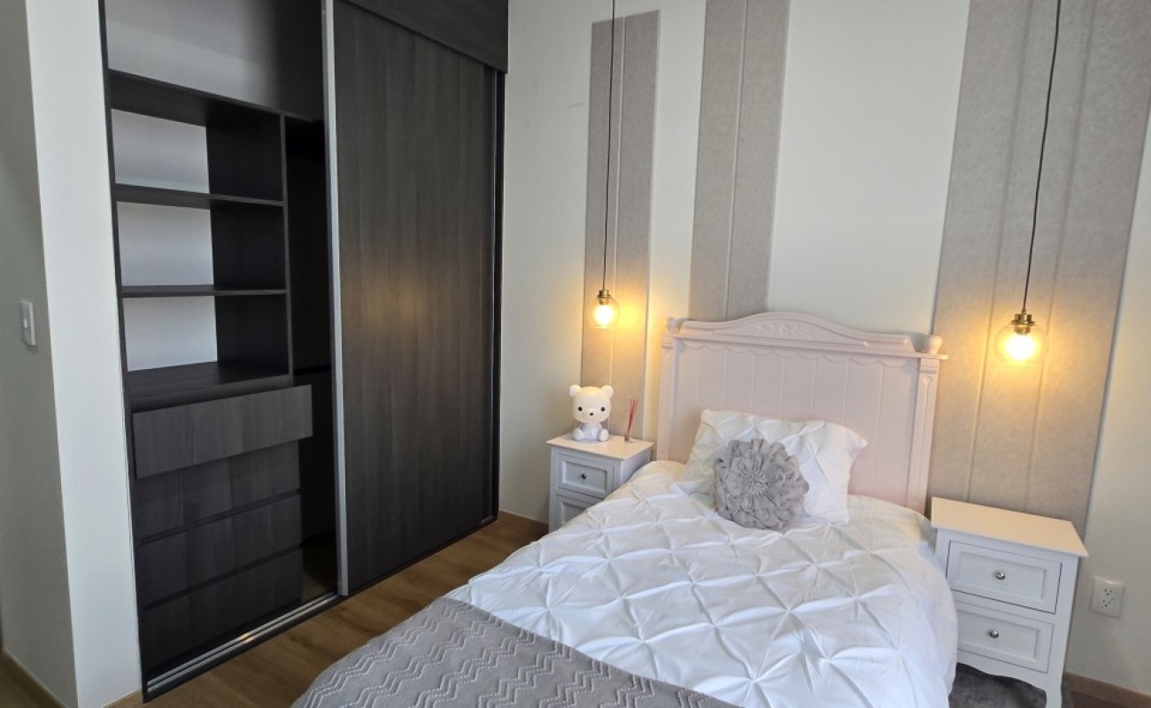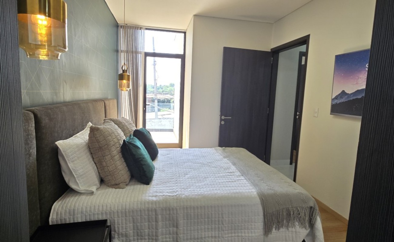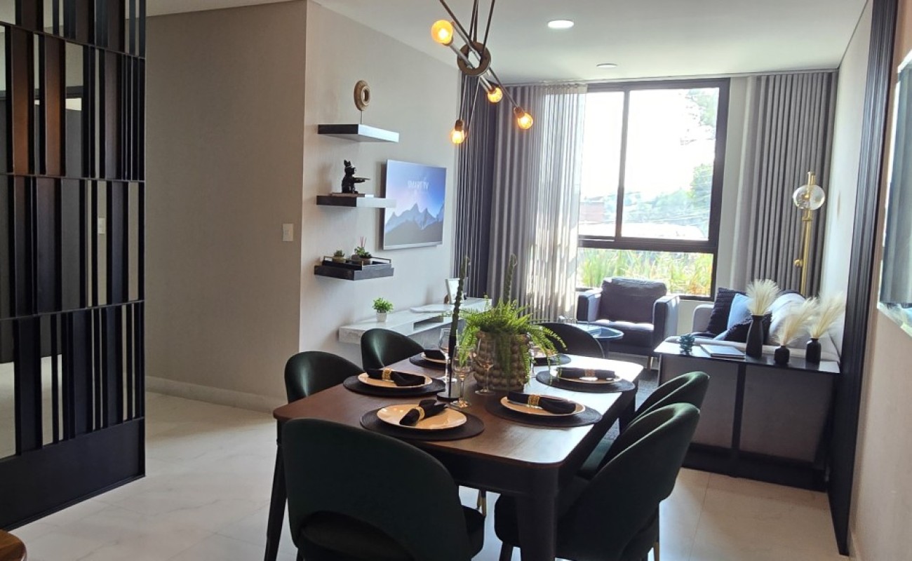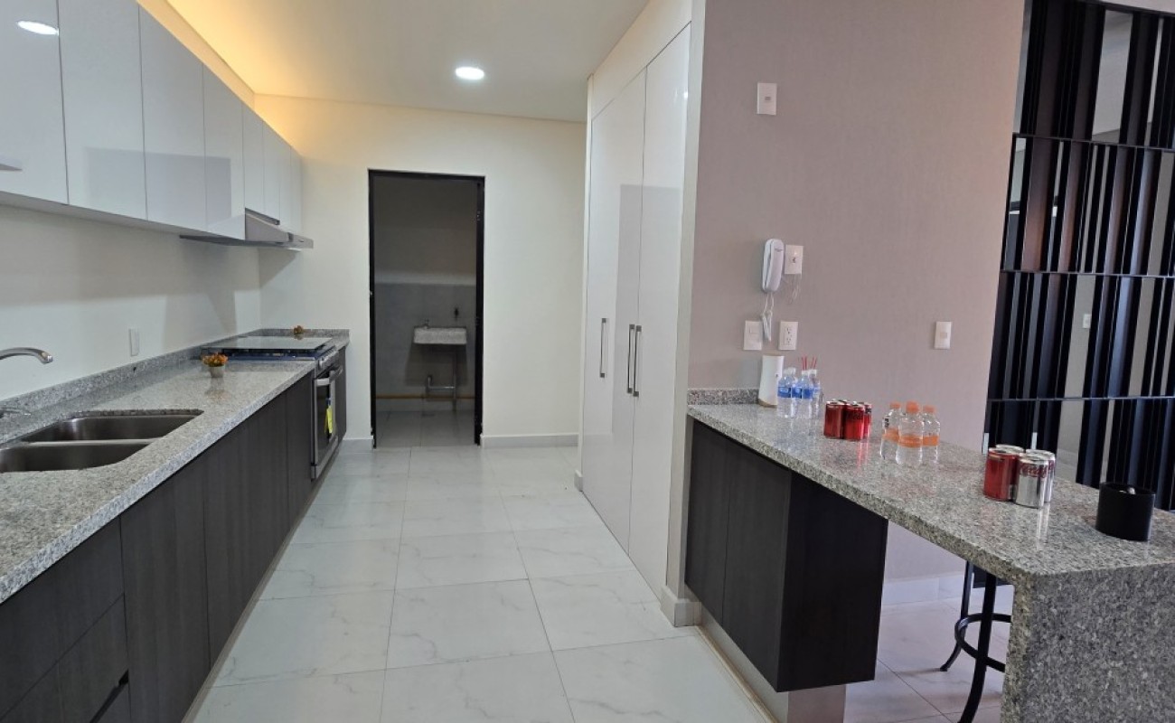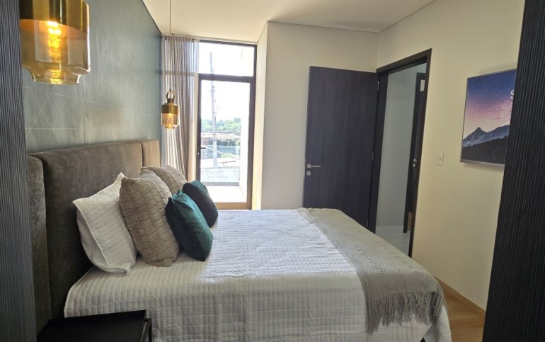El departamento cuenta con excelentes acabados, pisos de porcelanato, techos altos y una distribución funcional:
