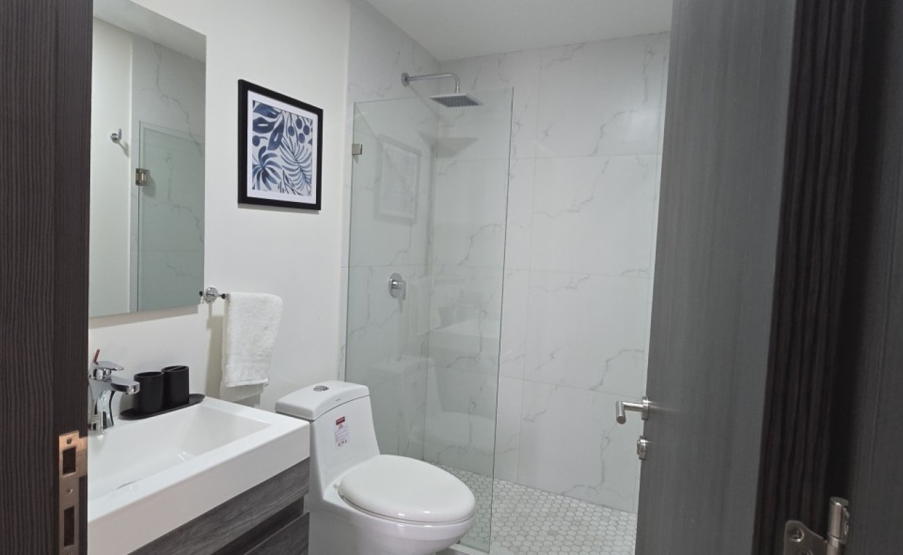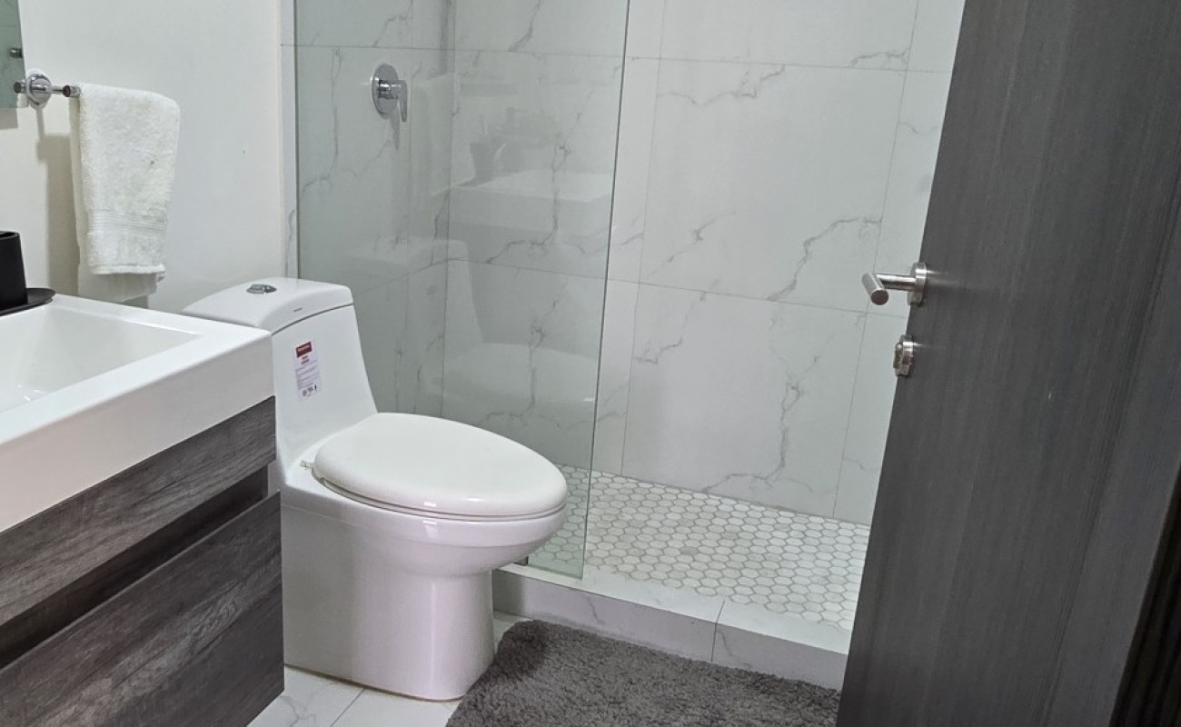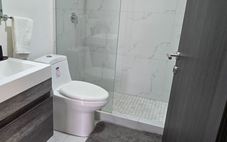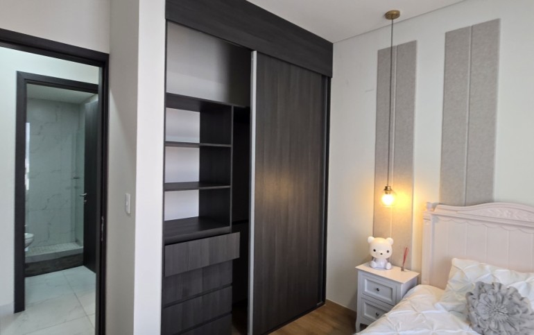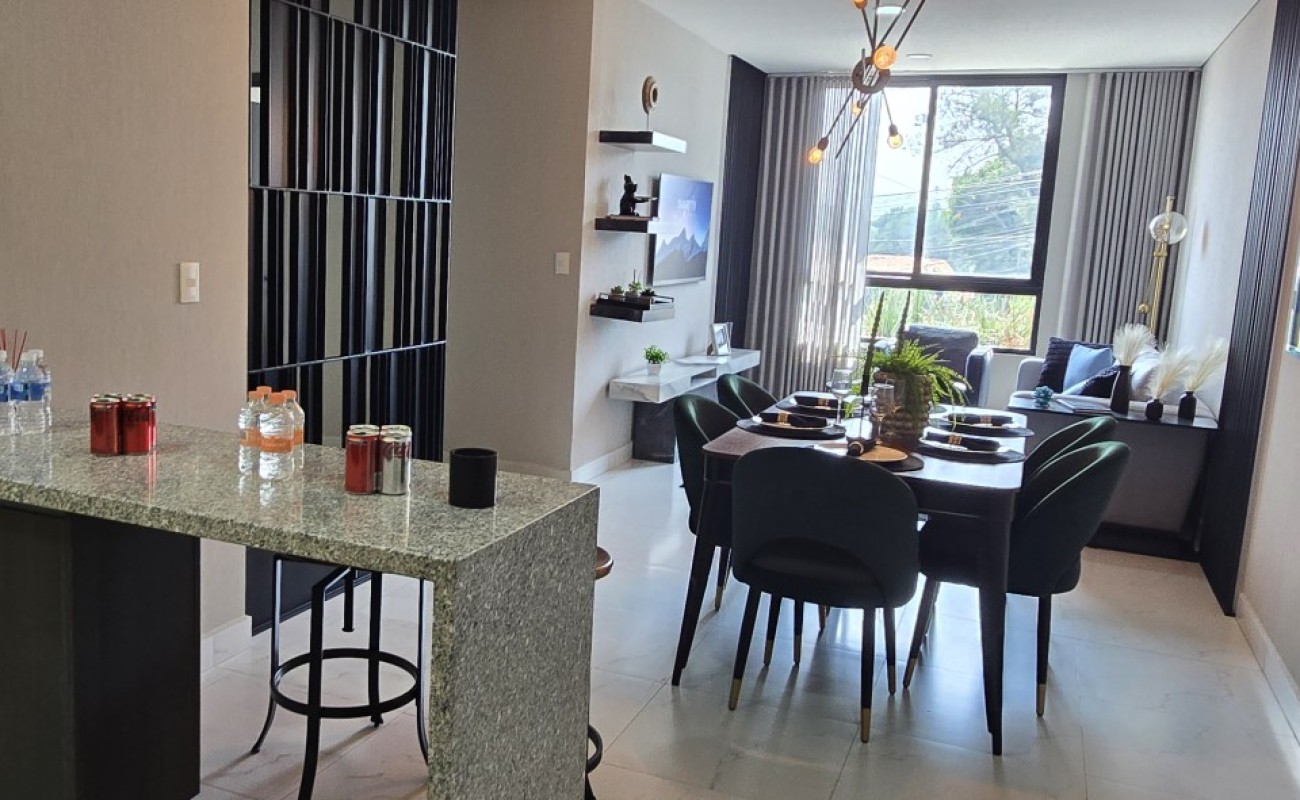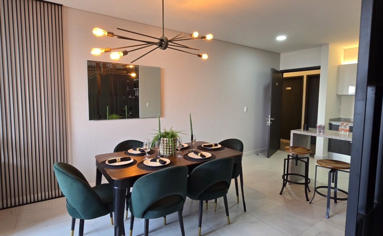 El departamento cuenta con excelentes acabados, pisos de porcelanato, techos altos y una distribución funcional: