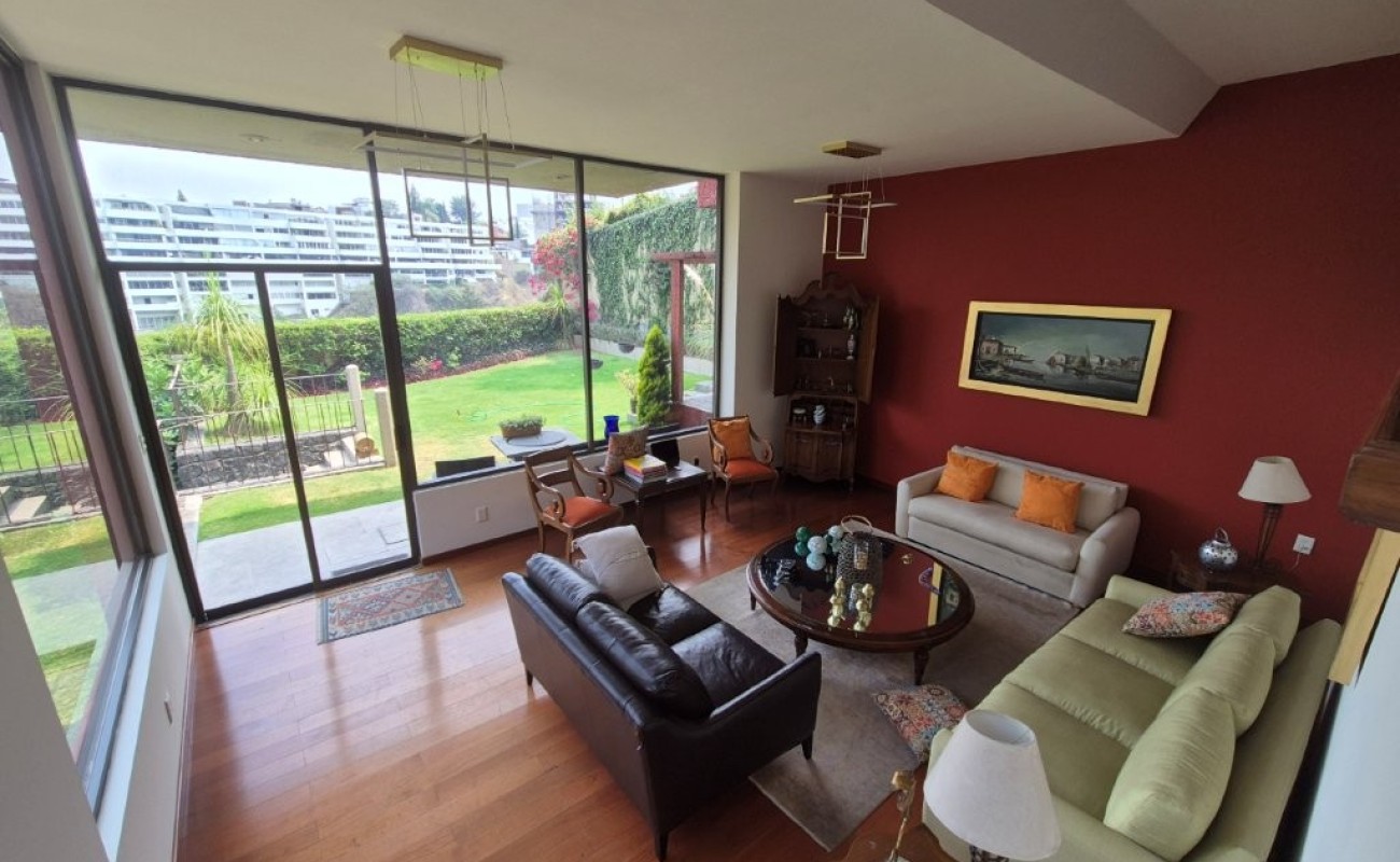Consta de estancia, sala comedor, medio baño, bar, cocina integral con isla en el centro y amplia alacena, antecomedor, cuarto de servicio con baño, cuarto de lavado con patio de tendido, sala de tv, 5 recámaras, principal con balcón, 2 vestidores, baño completo y vista arbolada, otras 2 recámaras con closet y comparten baño, otra recámara con baño, vestidor y estudio, una recámara de visitas con baño y entrada independiente, jardín bar con tarja, asador y baño completo, 2 lugares de estacionamiento cubiertos, una bodega. La casa disfruta de una zona federal
