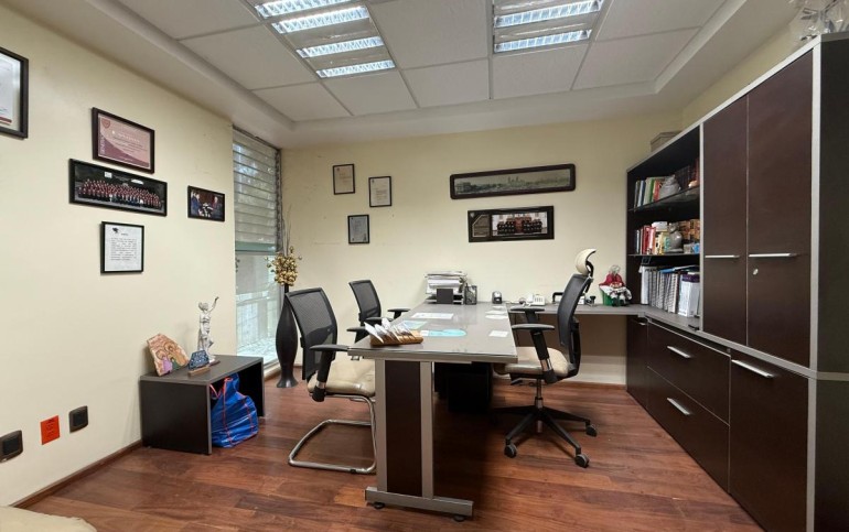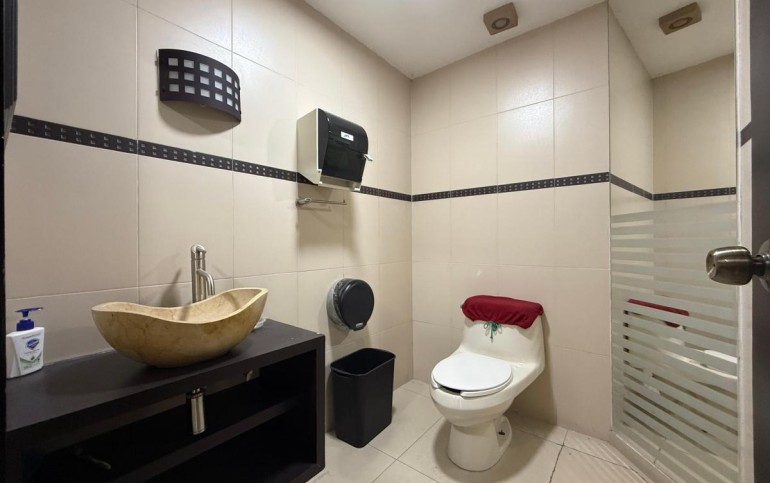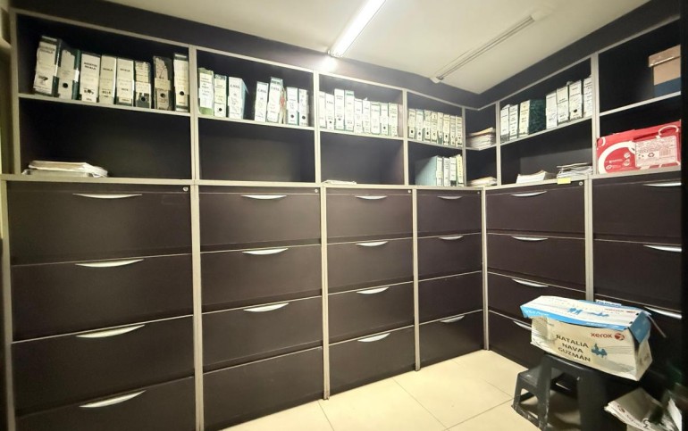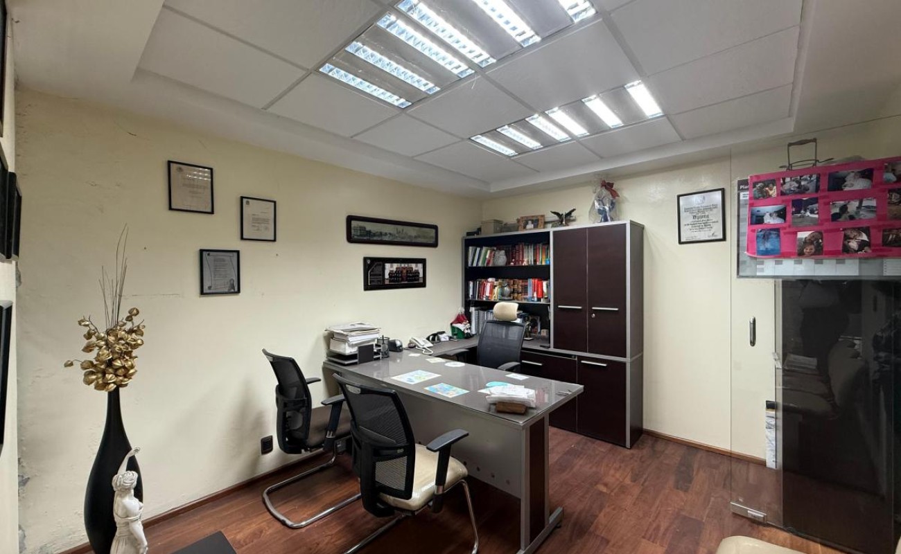 Planta baja: Recepción con detector de huellas, sala de espera, 2 medios baños, cocina equipada, área de archivo/bodega y 4 cubículos privados.