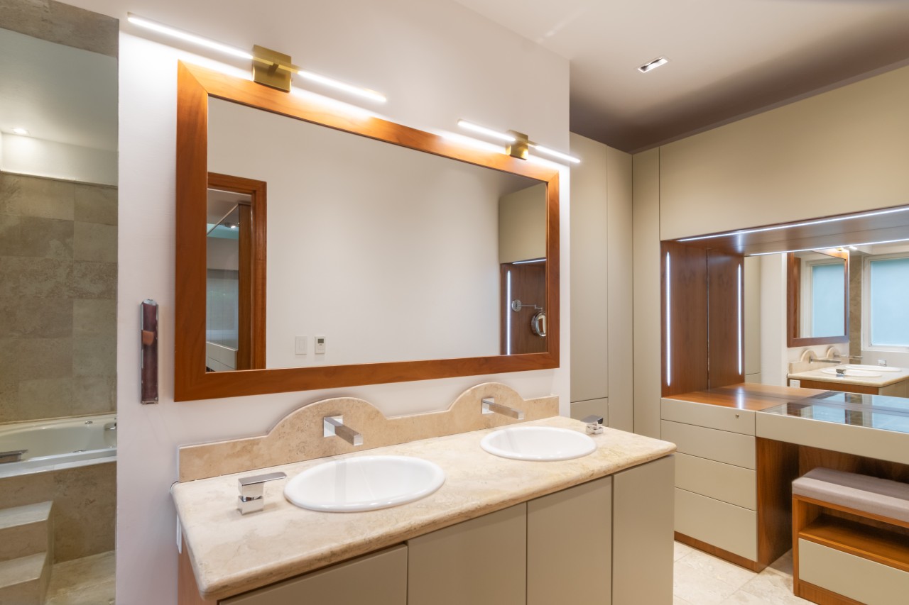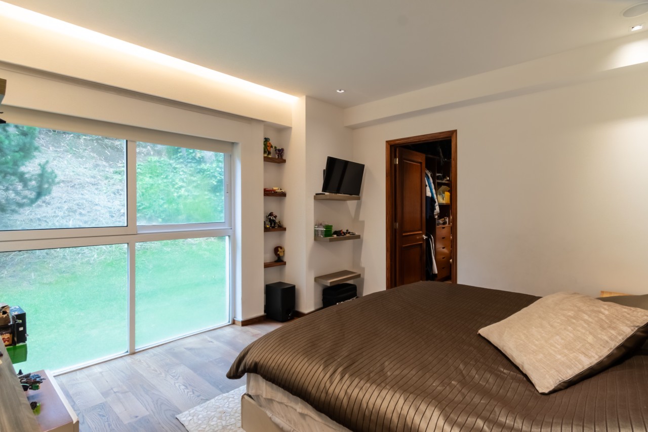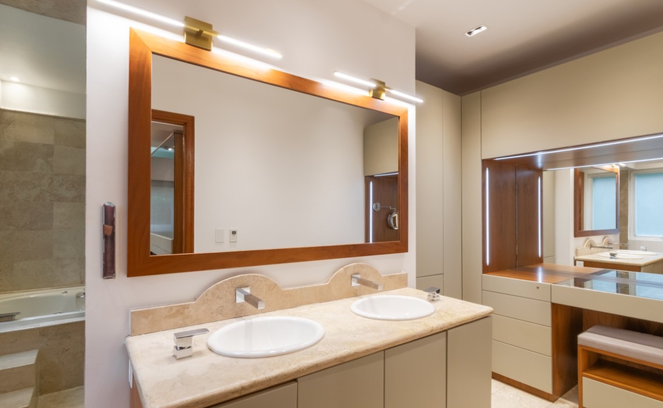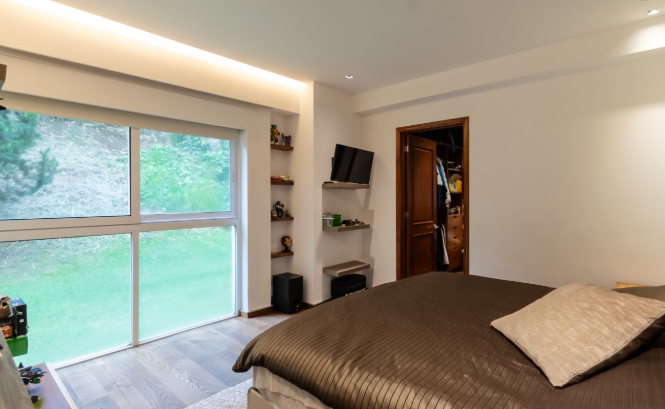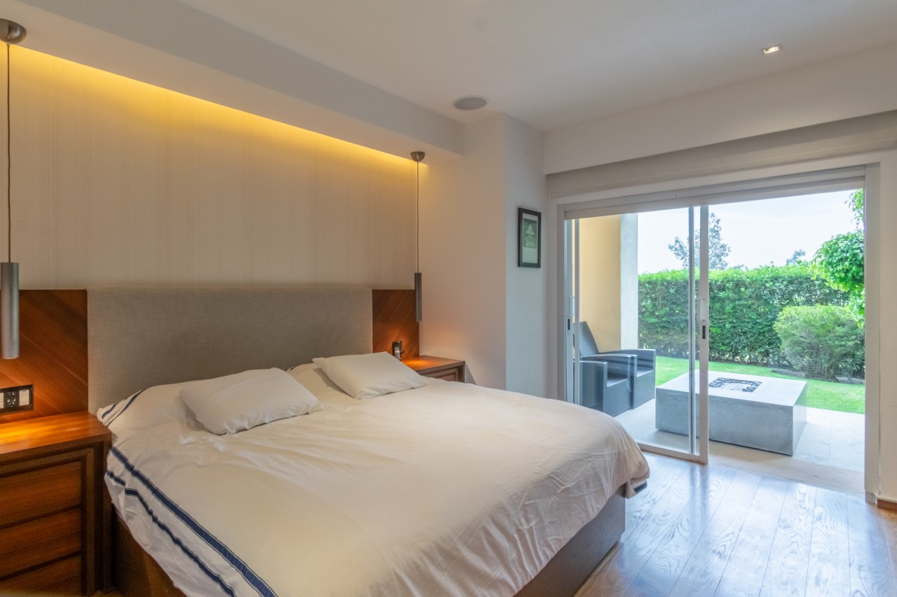 3 recámaras, cada una con baño completo y walk-in closet; la recámara principal incluye un vestidor hecho a la medida, área de tocador, vapor y tina de hidromasaje, además de acceso directo al jardín.