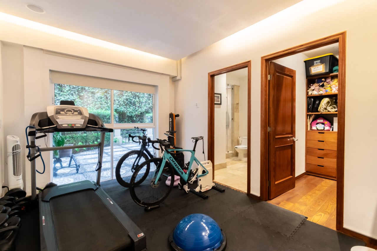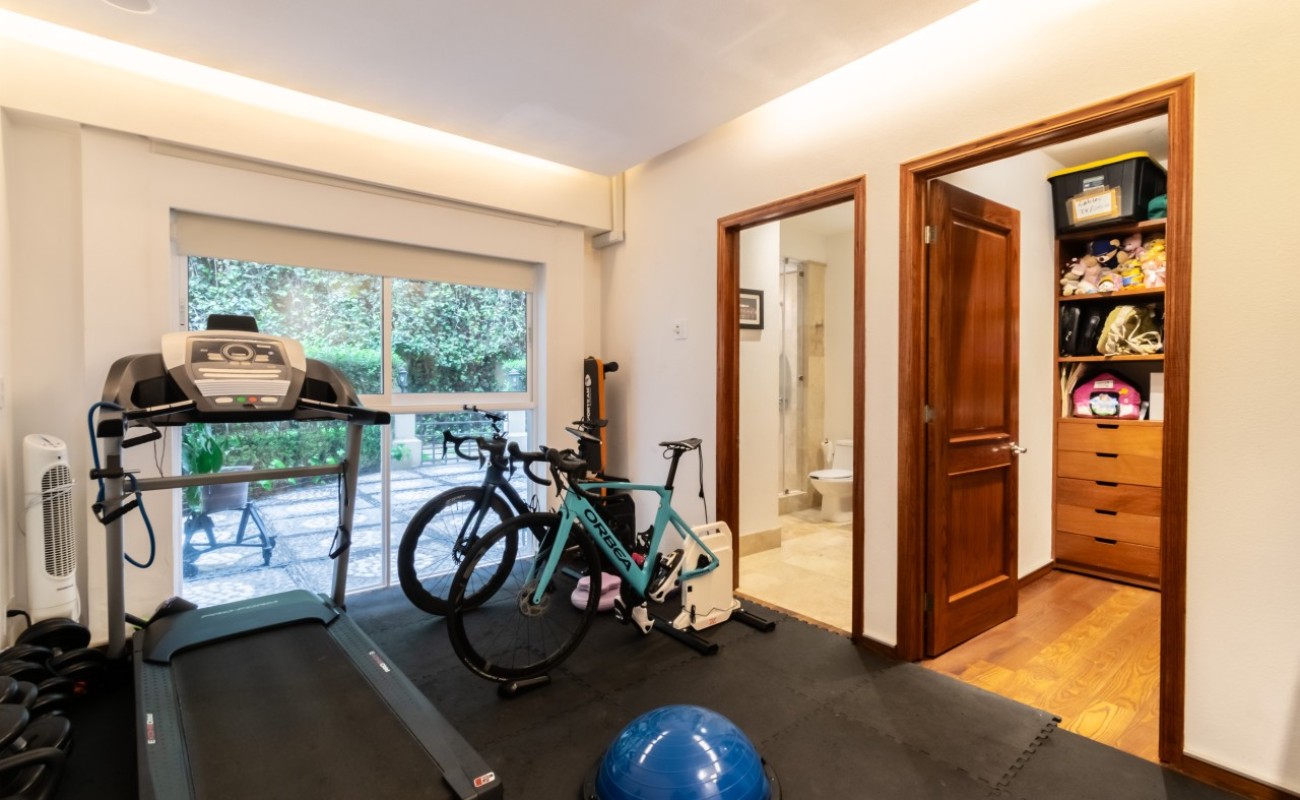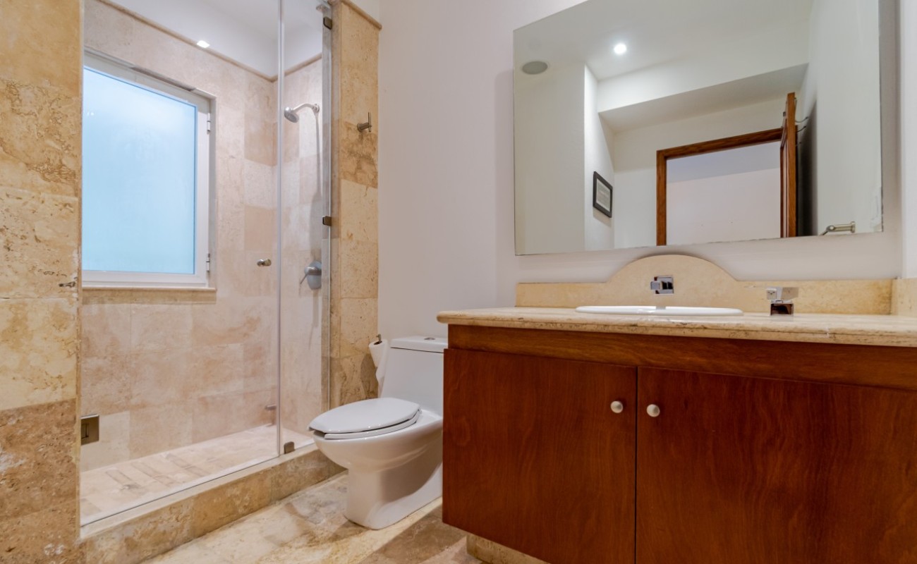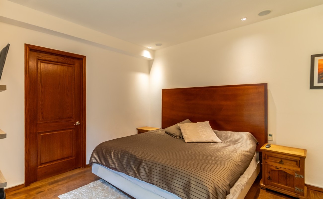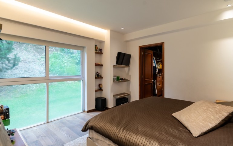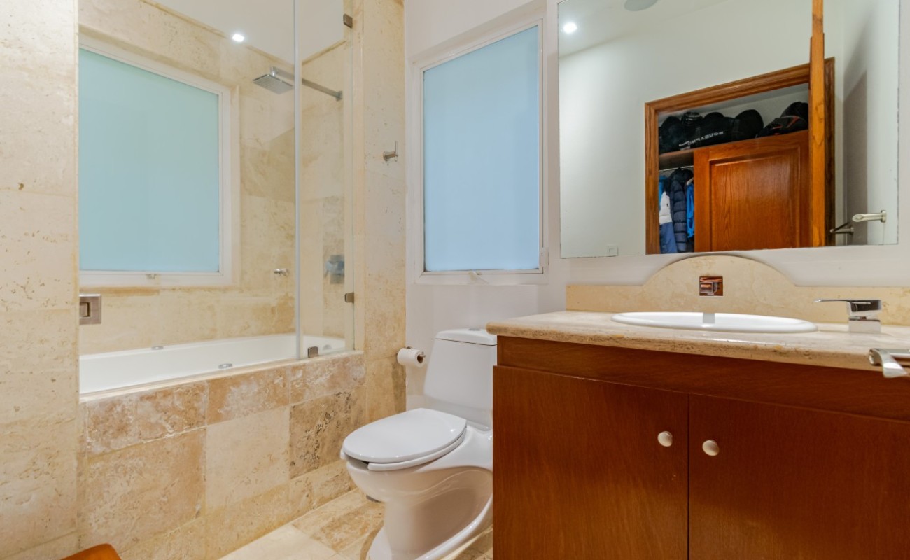 3 recámaras, cada una con baño completo y walk-in closet; la recámara principal incluye un vestidor hecho a la medida, área de tocador, vapor y tina de hidromasaje, además de acceso directo al jardín.