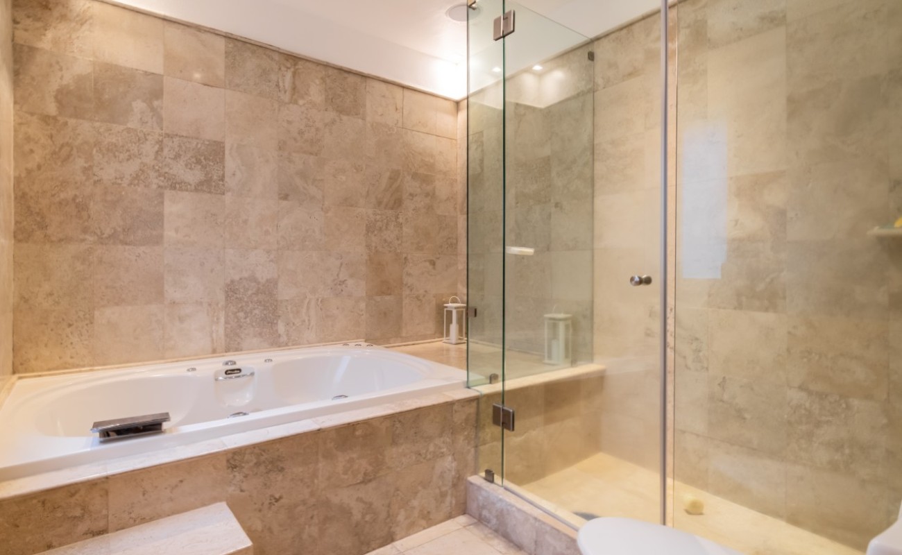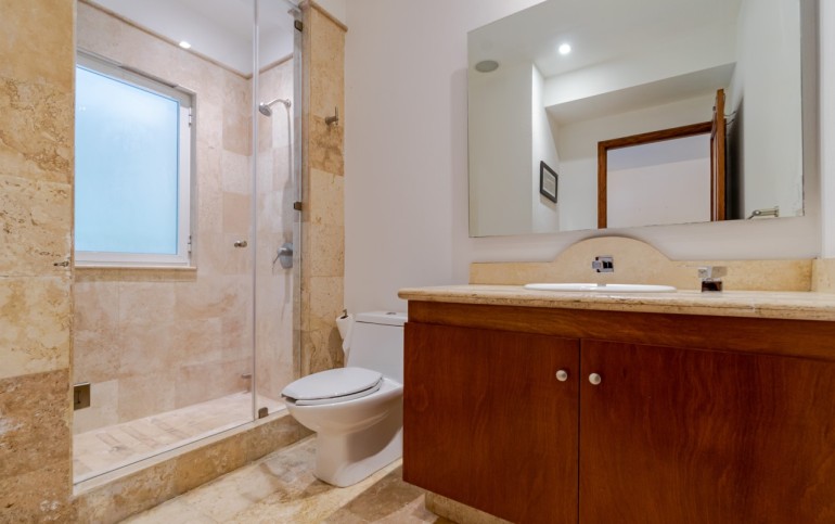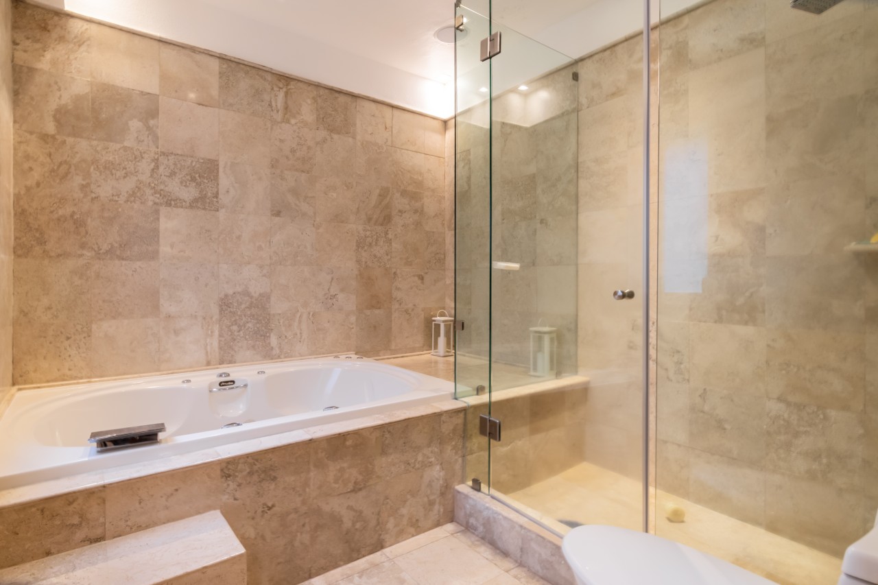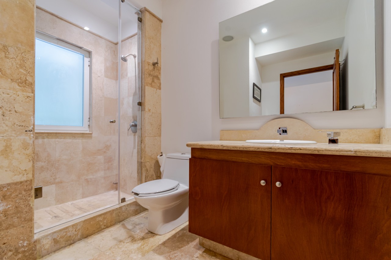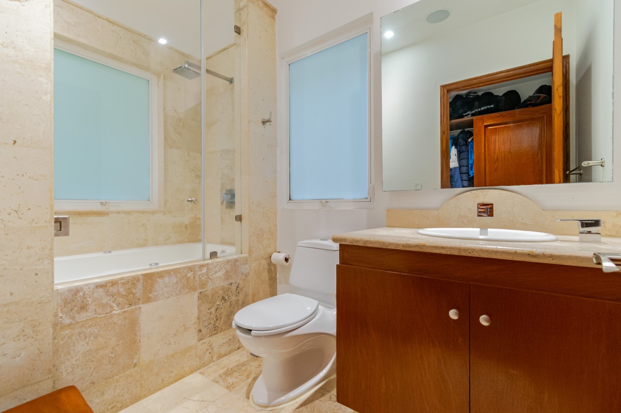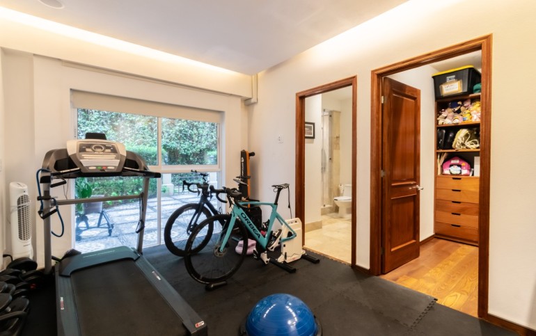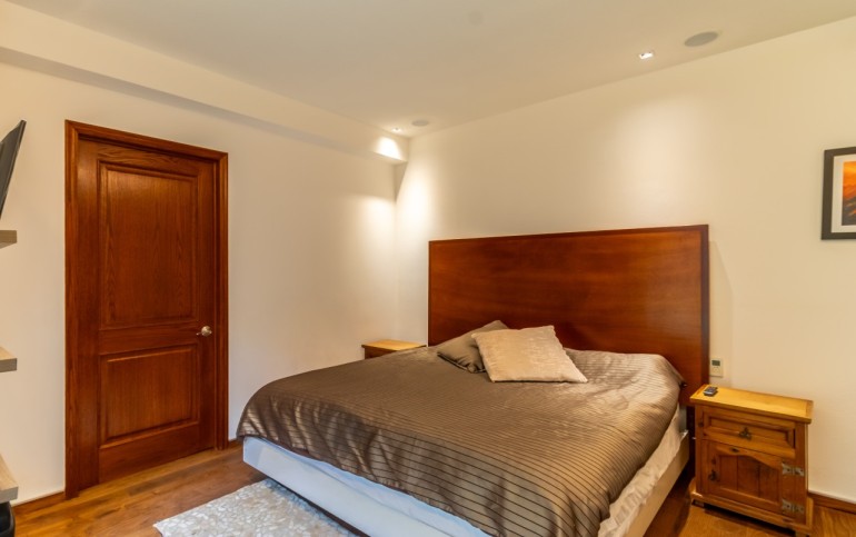 3 recámaras, cada una con baño completo y walk-in closet; la recámara principal incluye un vestidor hecho a la medida, área de tocador, vapor y tina de hidromasaje, además de acceso directo al jardín.