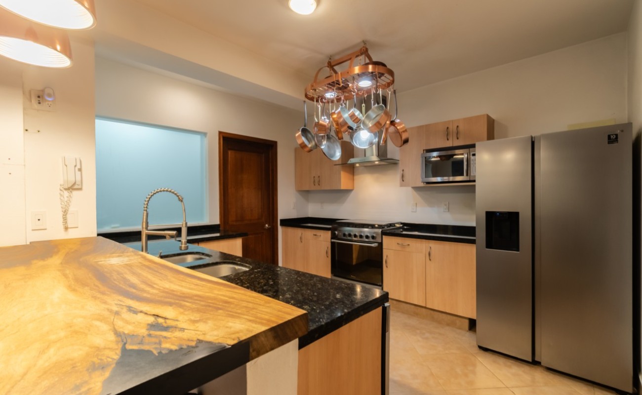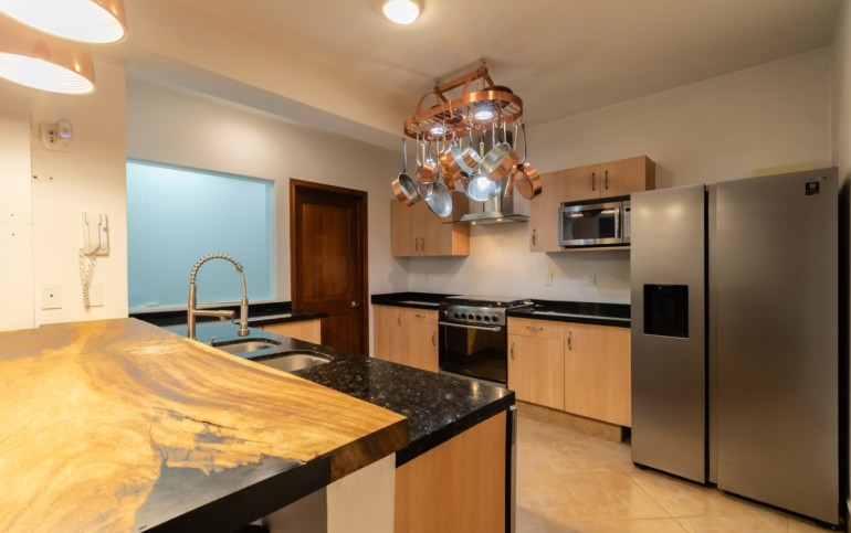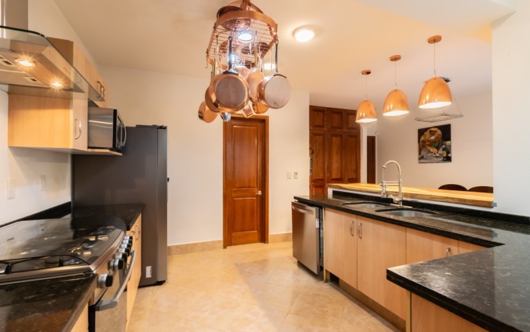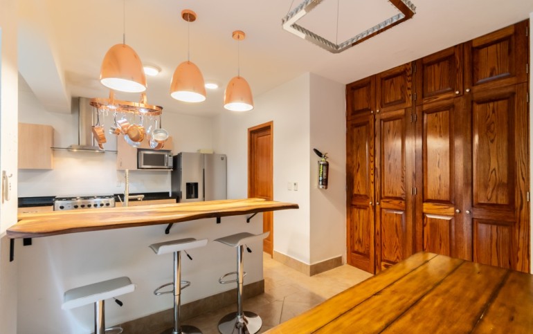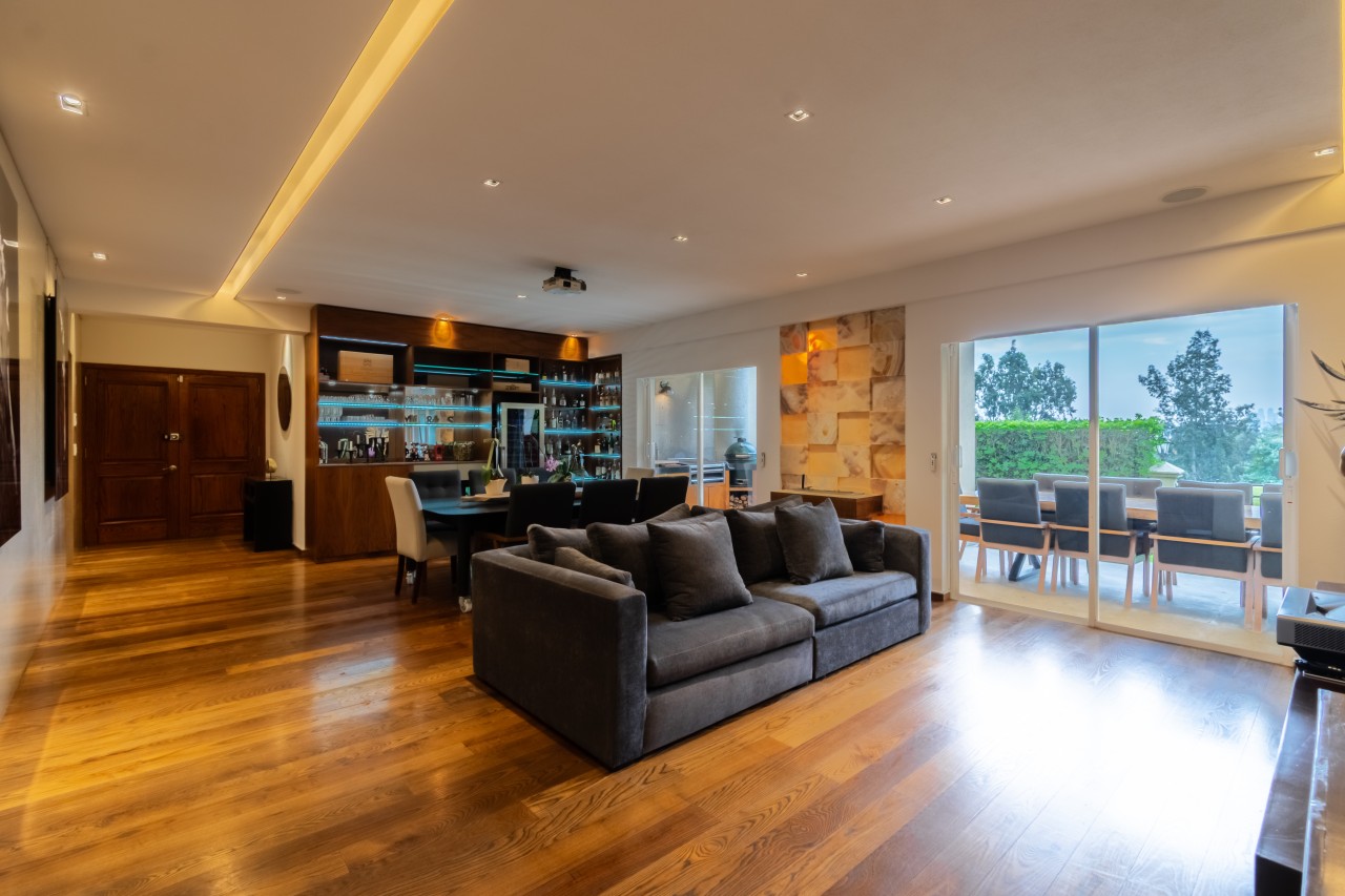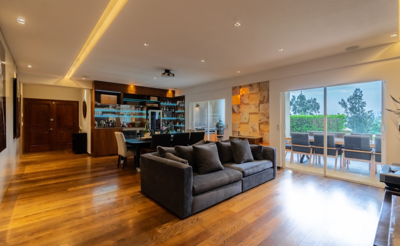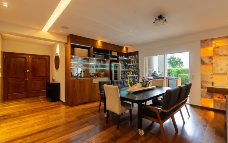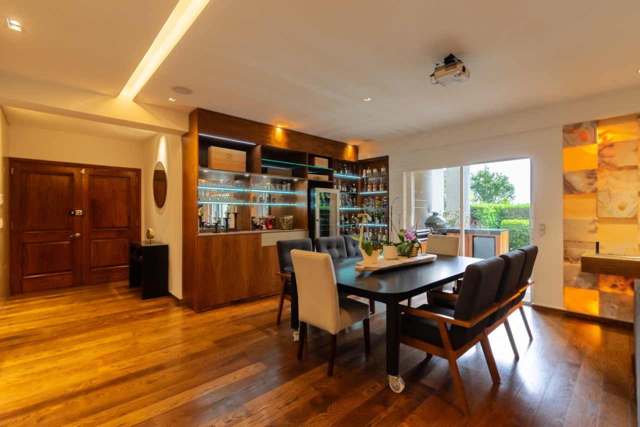 Cuenta con techos altos, pisos de madera, paredes de mármol ónix, iluminación directa e indirecta, sistema de sonido, cámaras de seguridad, persianas automáticas y aire acondicionado.