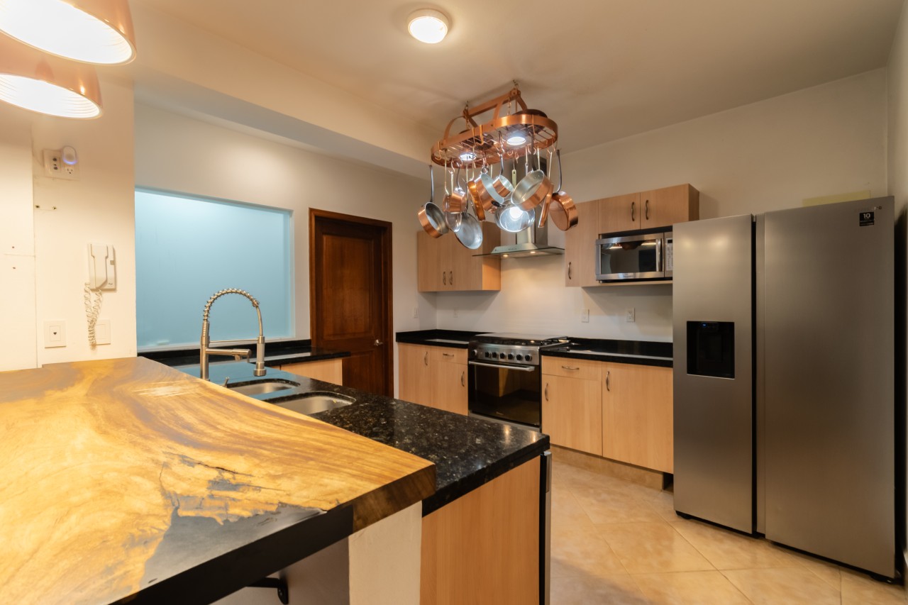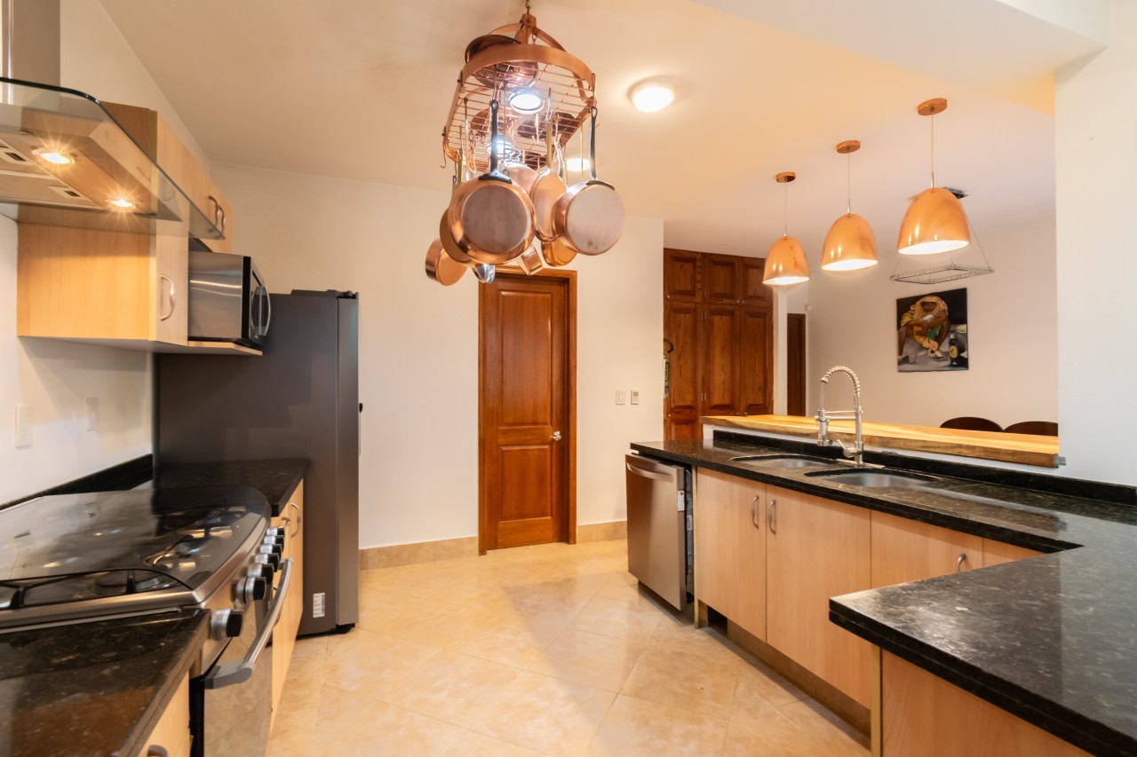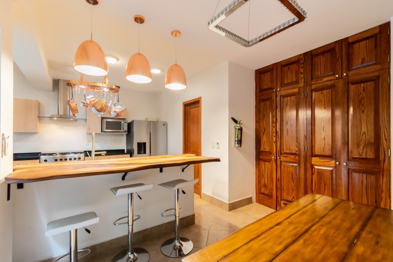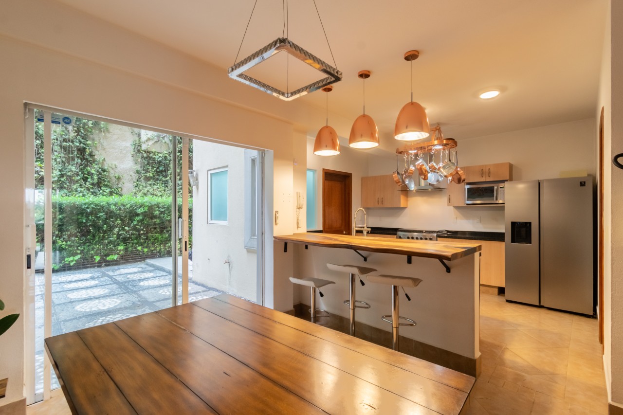El área social destaca por su amplia estancia–comedor con acceso a la terraza y al jardín. La cocina integral, equipada y con desayunador, tiene salida a la terraza trasera. Además, dispone de cuarto de servicio con baño y área de lavado.