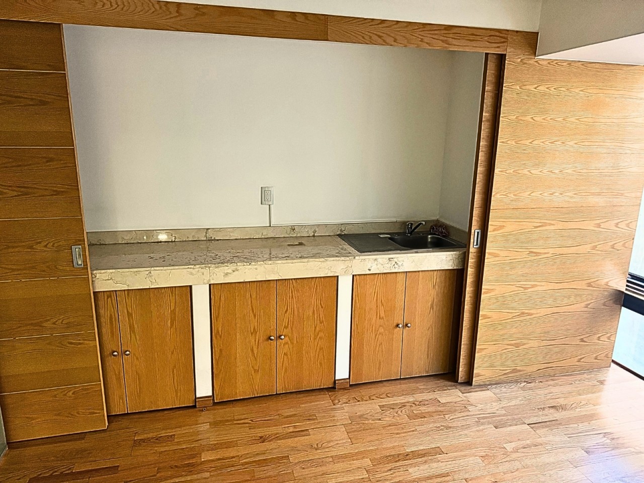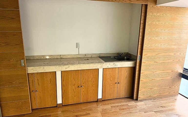 Área de cocina con barra y puertas corredizas que ocultan completamente los servicios