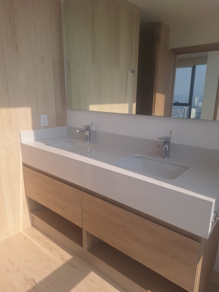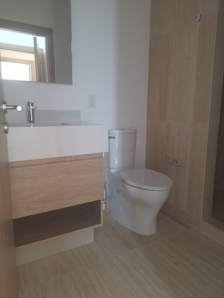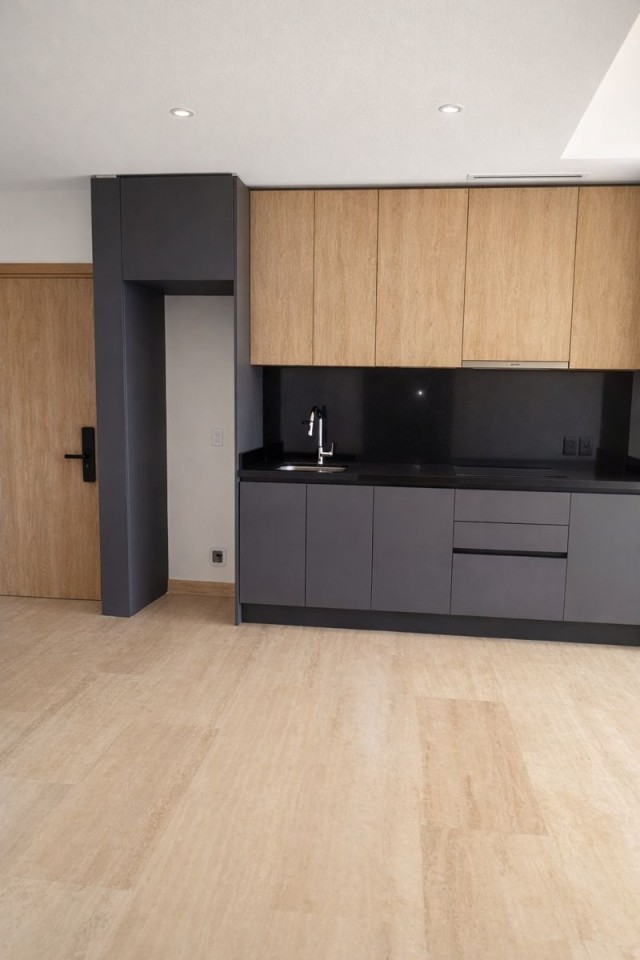 Cuenta con acabados de lujo, pisos de mármol y madera de ingeniería. Distribución funcional: estancia–comedor, medio baño de visitas, cocina integral equipada, 2 recámaras (principal con vestidor y baño completo; secundaria con clóset y baño propio), cuarto de lavado y 2 cajones de estacionamiento.